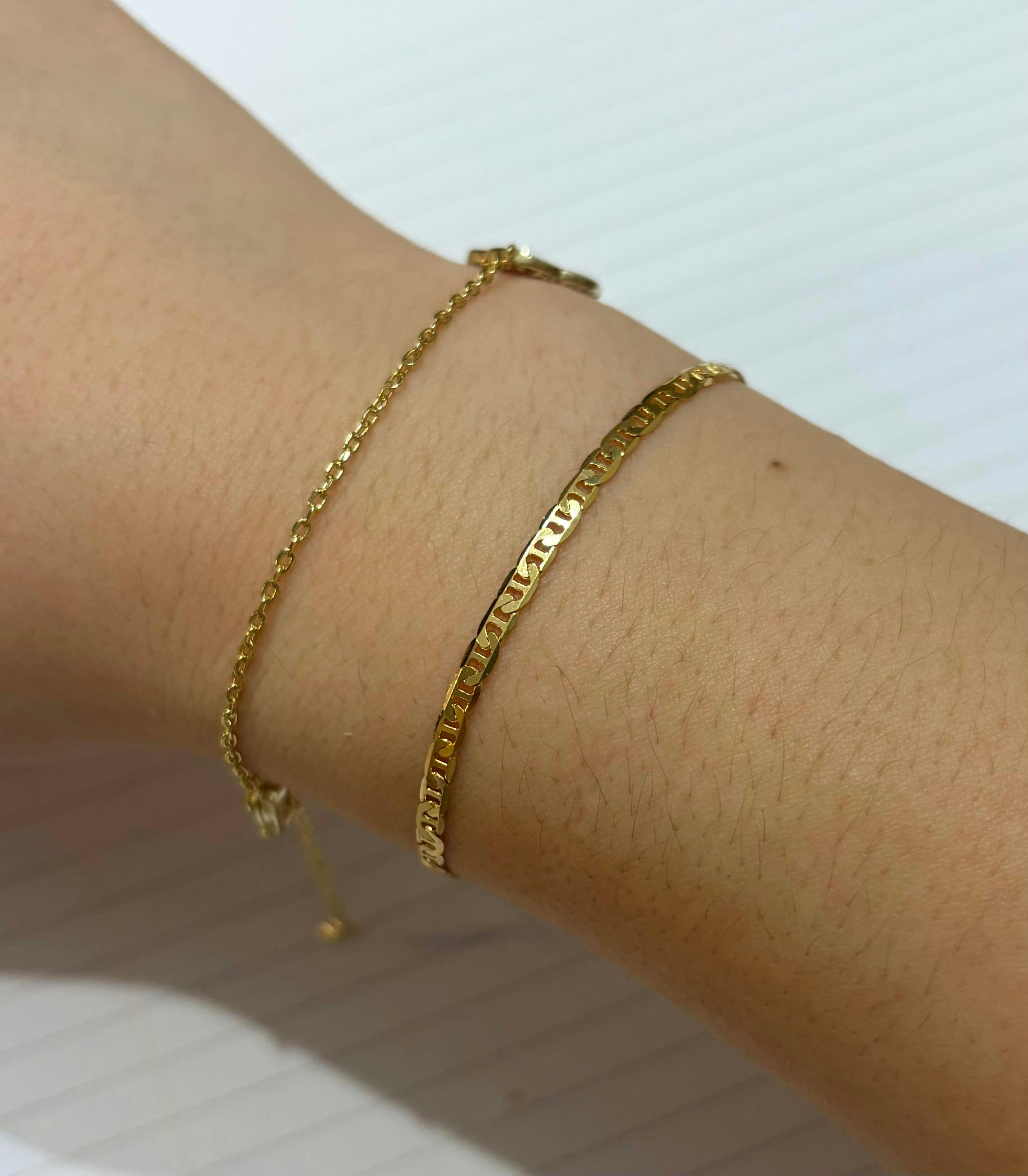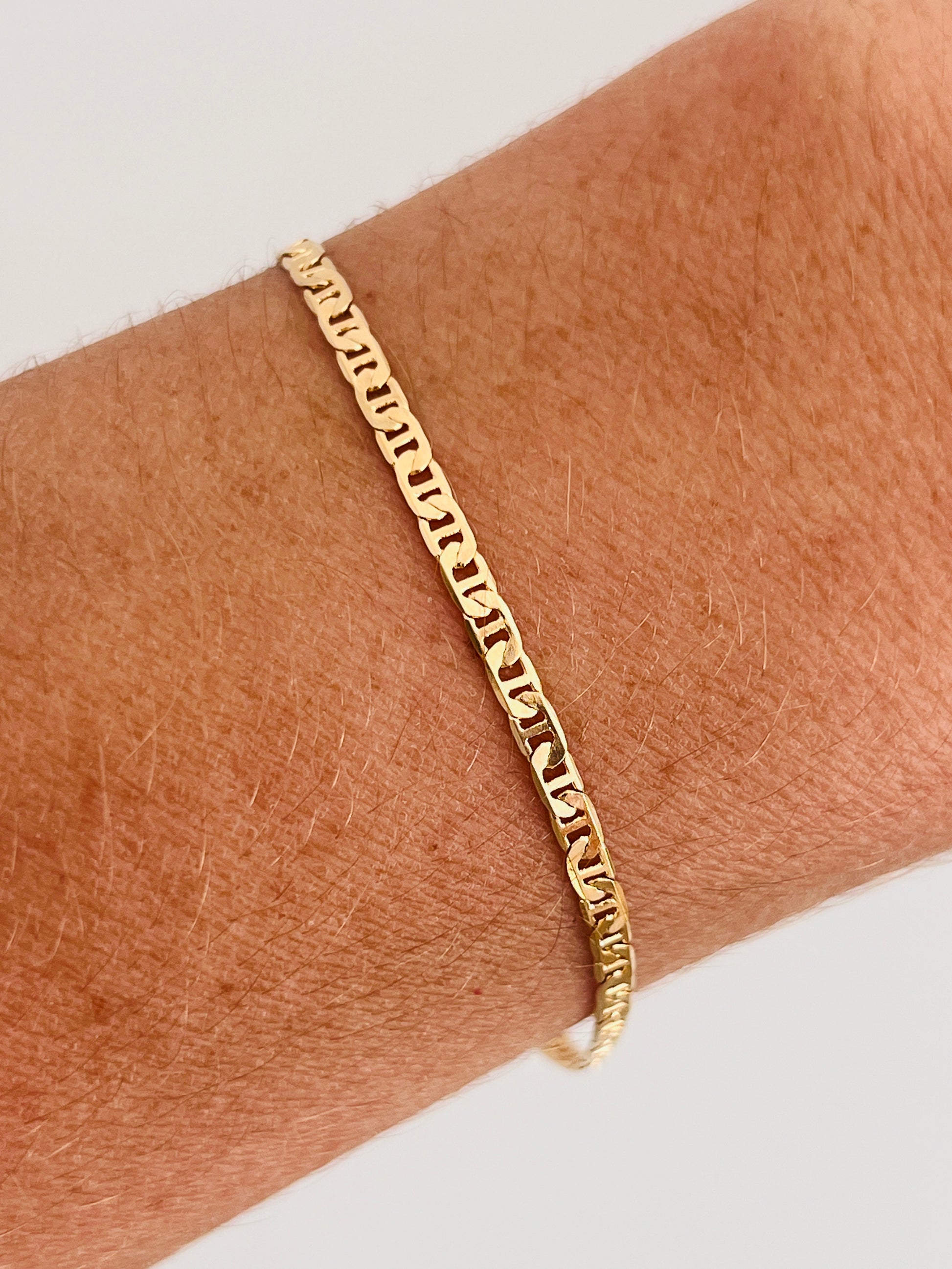 The Gold Filled 2mm Mariner Link Bracelet from Haus of Monogram brings classic nautical-inspired style in a sleek, delicate form. Crafted from a thick layer of 18kt gold filled over a strong base metal, this bracelet offers a luxurious shine and timeless appeal—without the solid gold price tag.