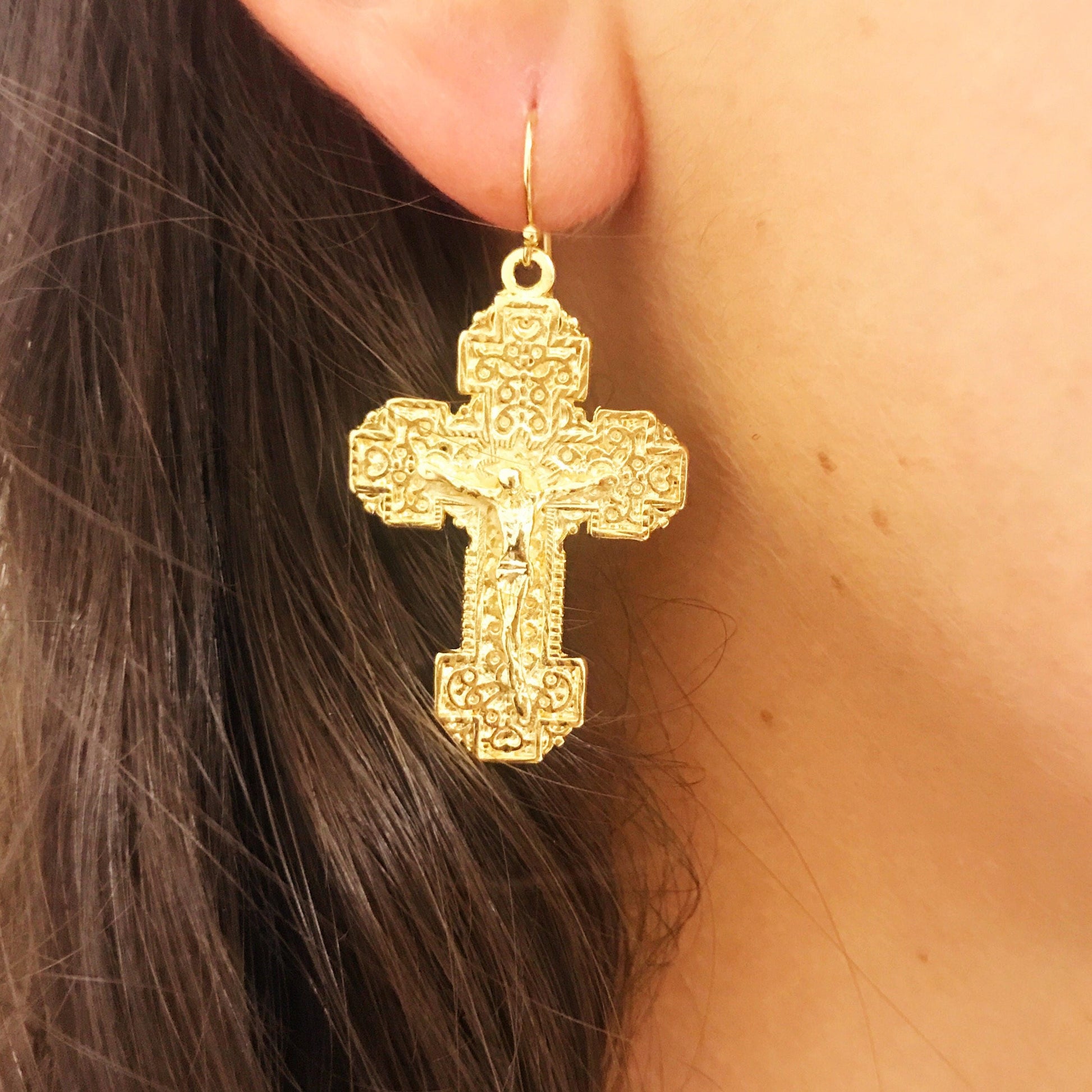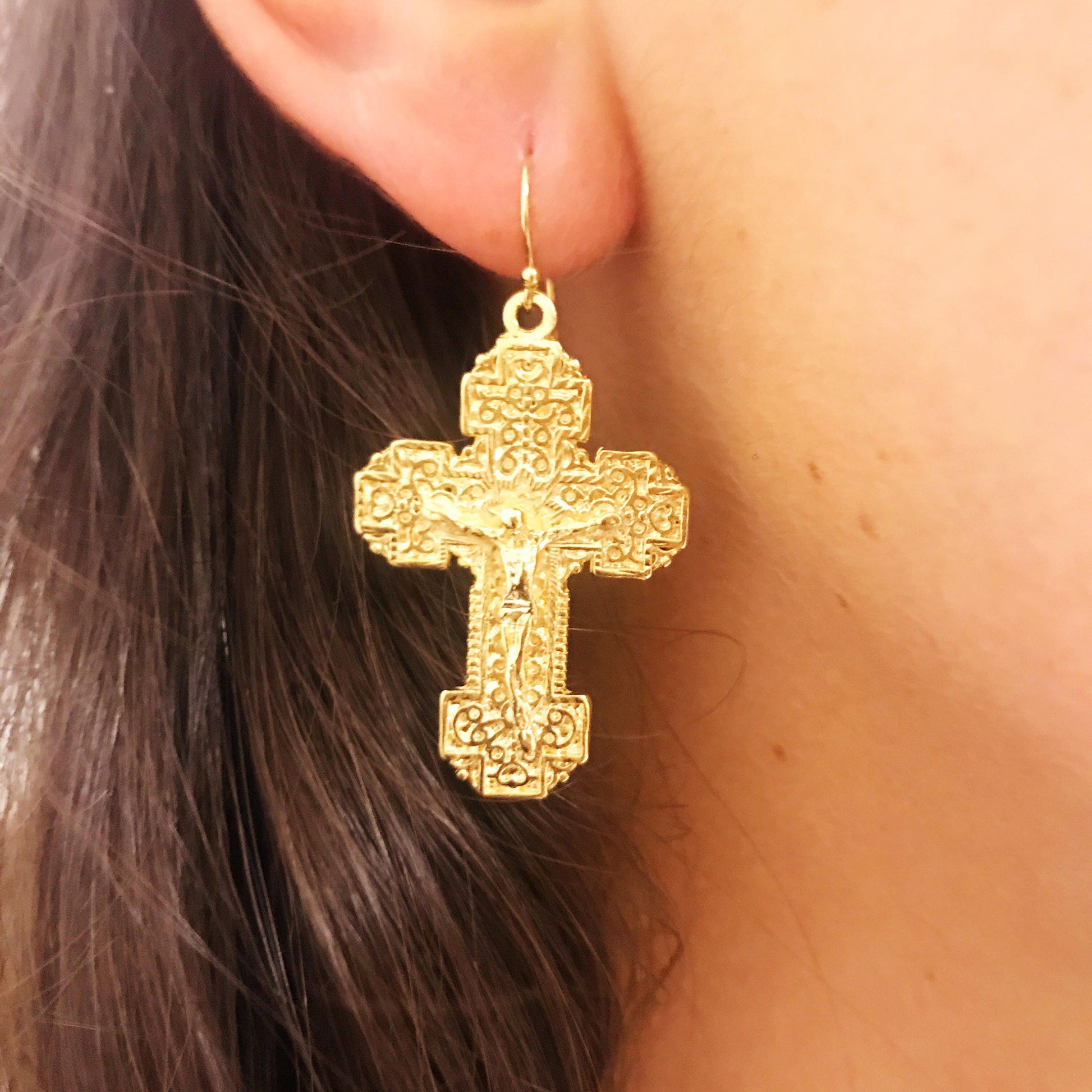 Crafted with a thick layer of 18kt gold bonded to a strong base metal, these earrings deliver shine, faith, and elegance. Crafted with care by Haus of Monogram.