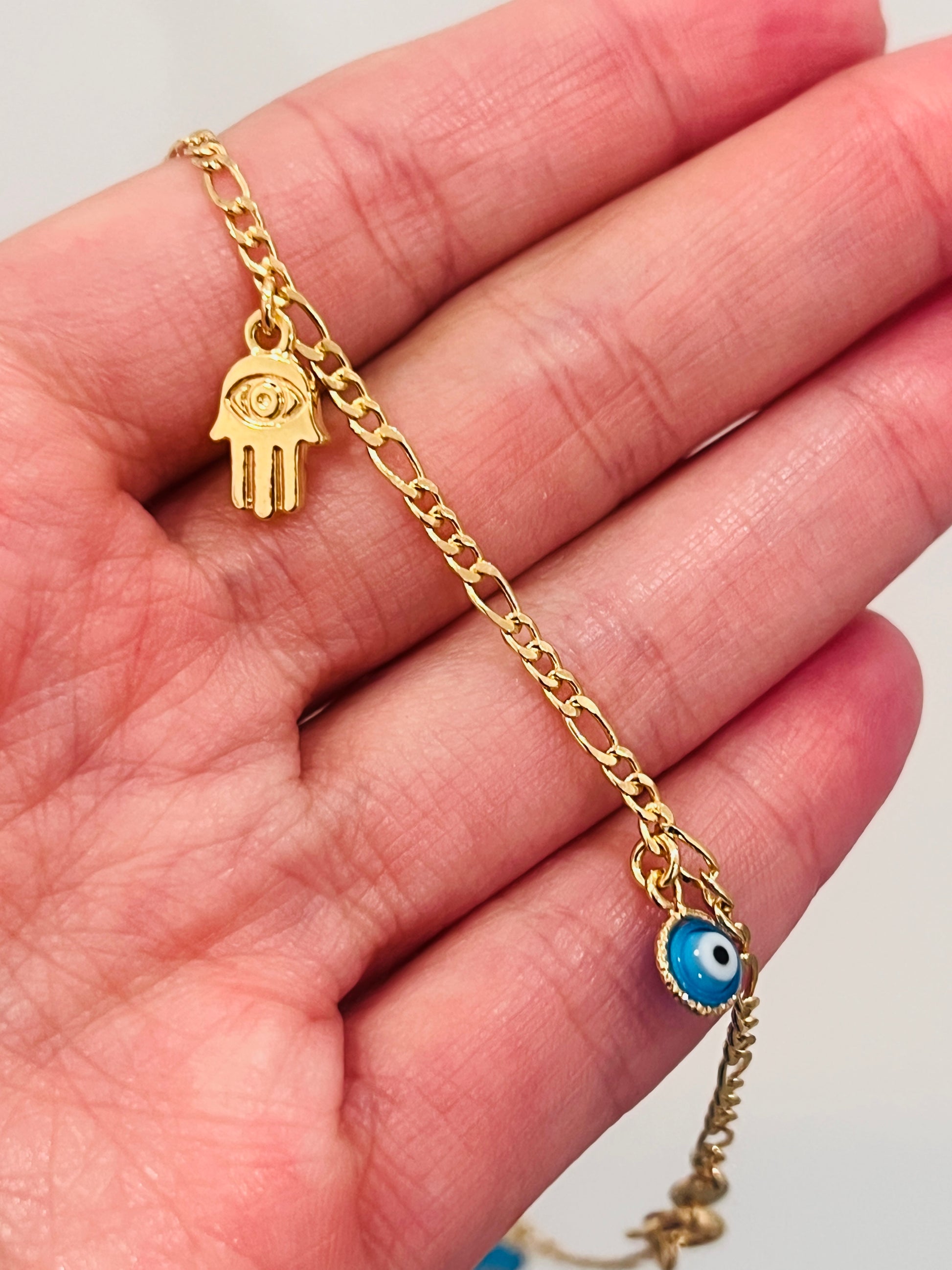 Gold Filled Evil Eye Hamsa Anklet | Size: 10" | 2mm Chain | 5.5mm Eye Charm