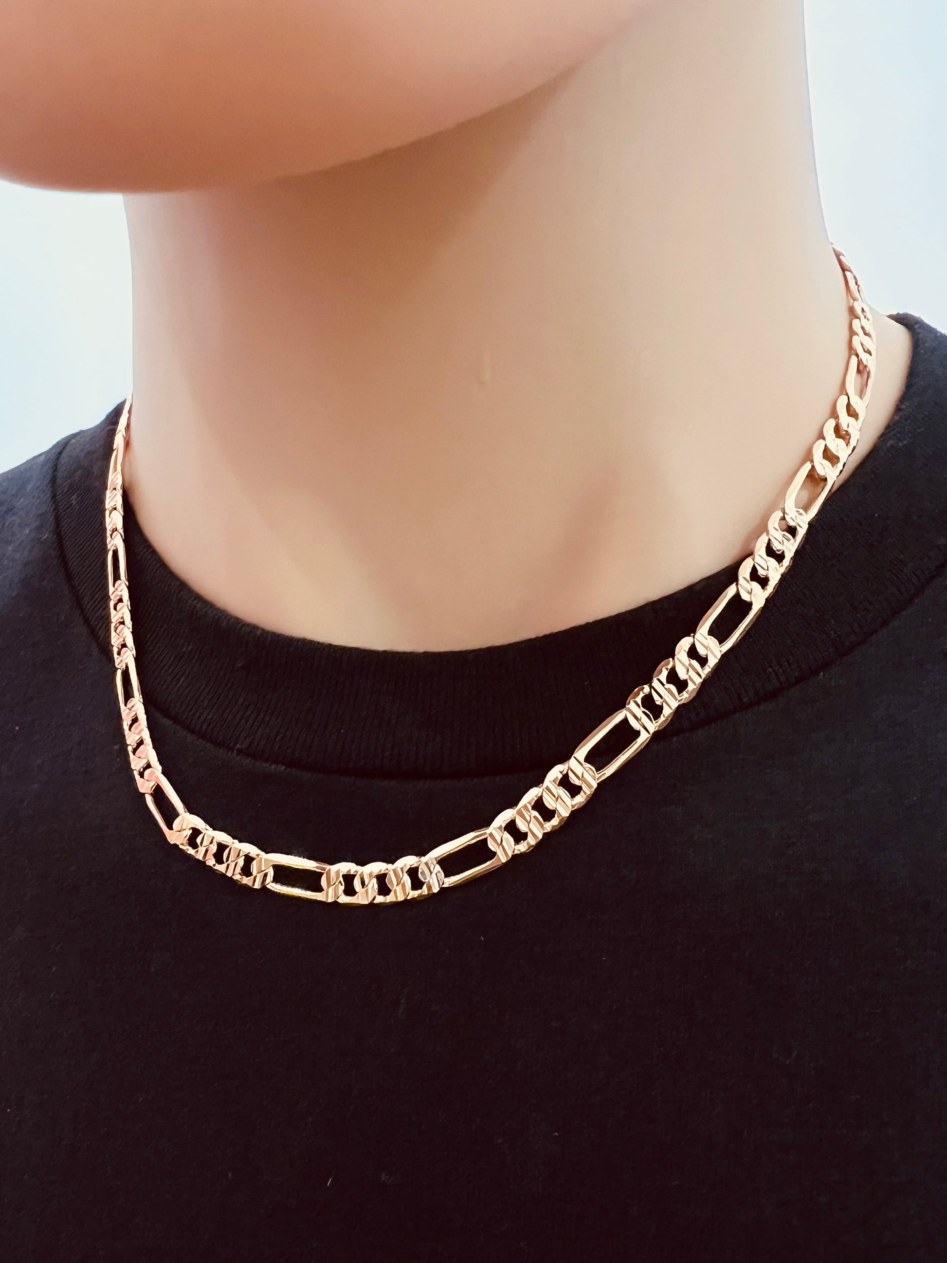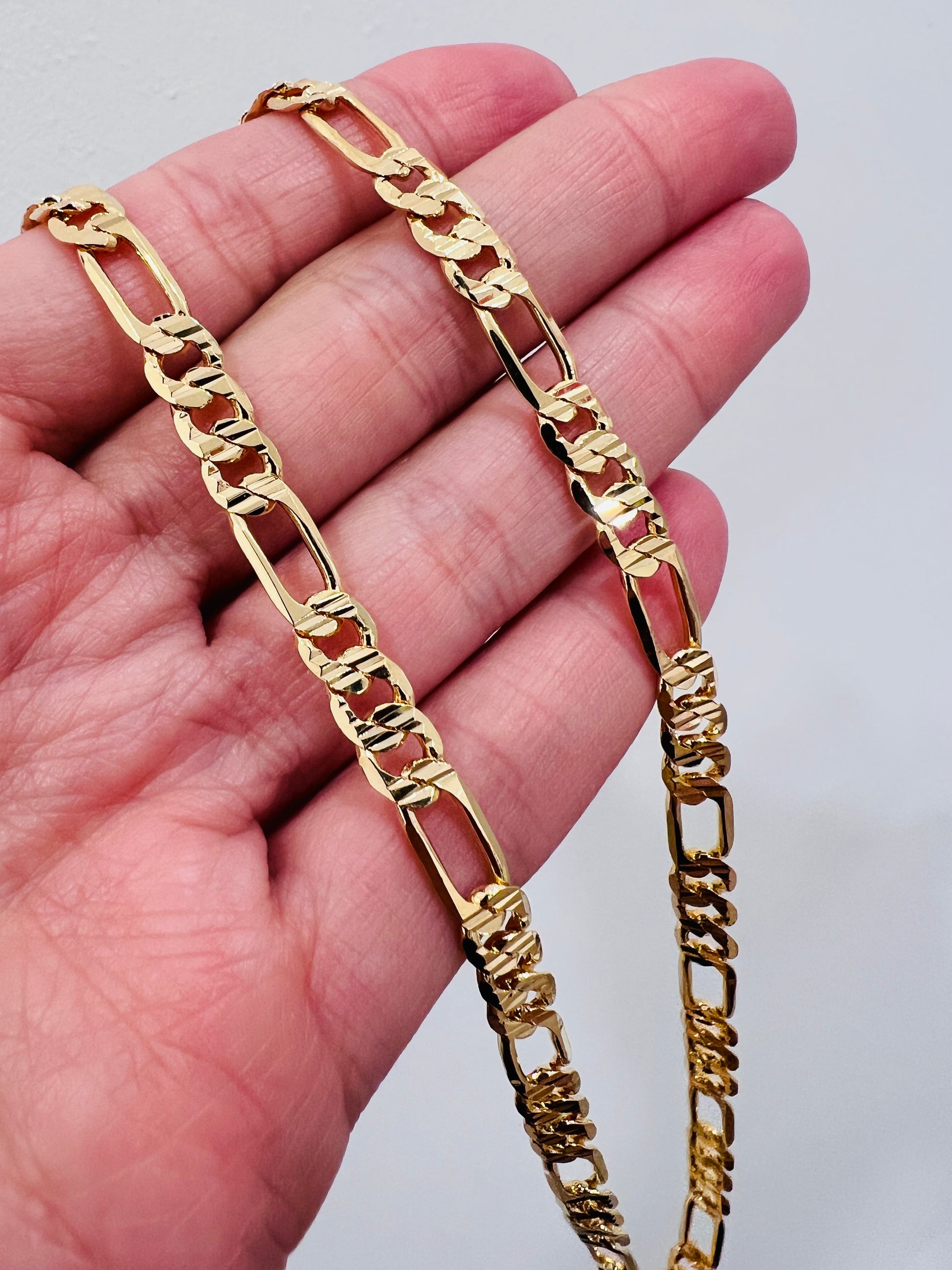 The Gold Filled 5.5mm Beveled Figaro Chain from Haus of Monogram makes a bold, classic statement. With its iconic alternating link pattern and polished beveled edges, this chain offers depth, shine, and texture that elevates any outfit. Crafted with a thick 18kt gold layer bonded over a durable base metal, it’s built to last while offering the look of solid gold. Available in extended lengths from 18" to 30", it's ideal for wearing alone or layering for a modern street-style aesthetic.