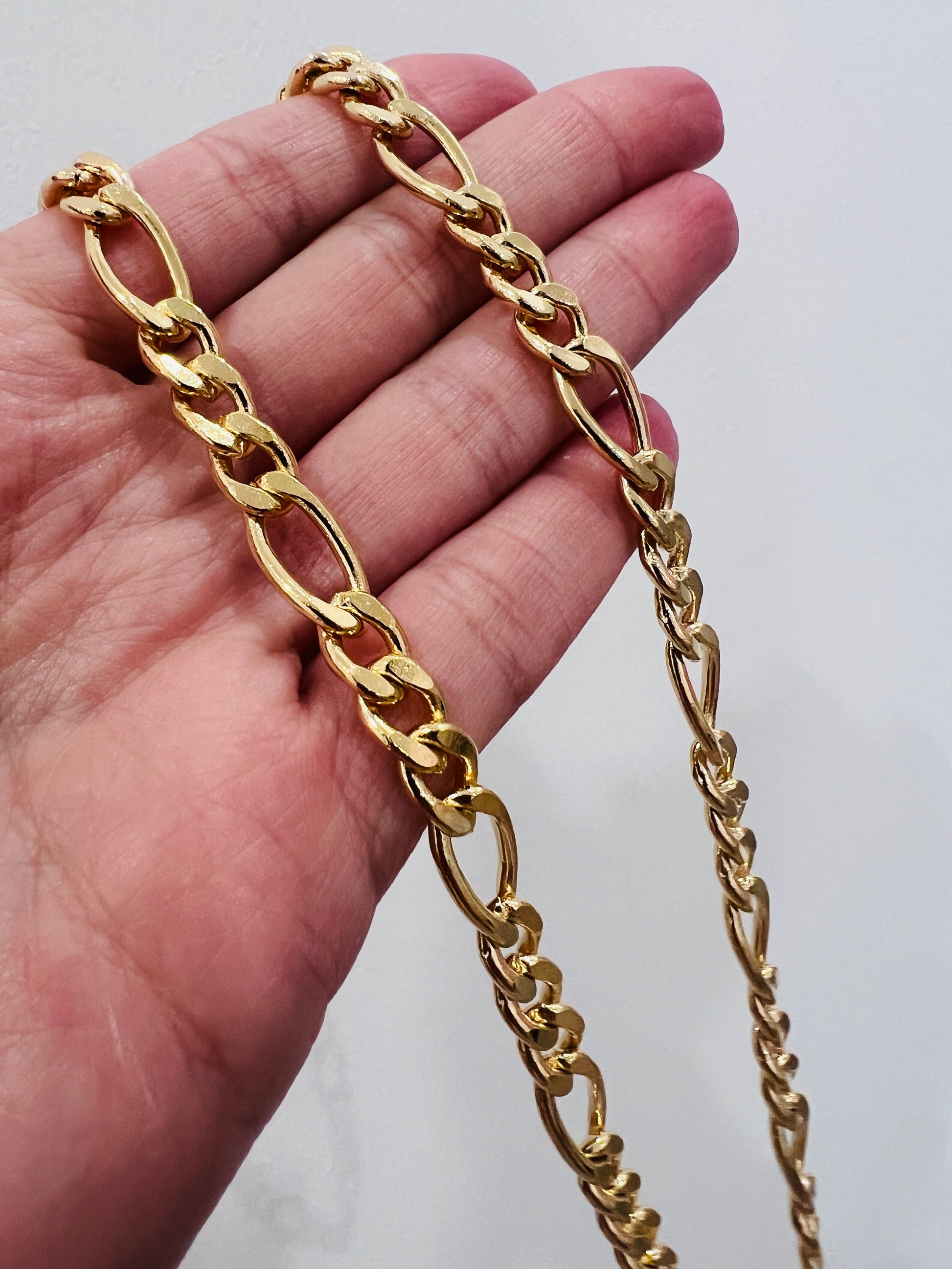 Elevate your accessory game with the Gold Filled 7mm Figaro Chain from Haus of Monogram. This bold and substantial chain features the iconic Figaro pattern, known for its classic three short links followed by a longer link. Crafted with a thick 18kt gold layer bonded to a durable base metal, this 7mm wide chain brings luxury and strength to your everyday style. Available in 20", 22", and 24" lengths, it’s perfect for standalone wear or pairing with your favorite pendant.