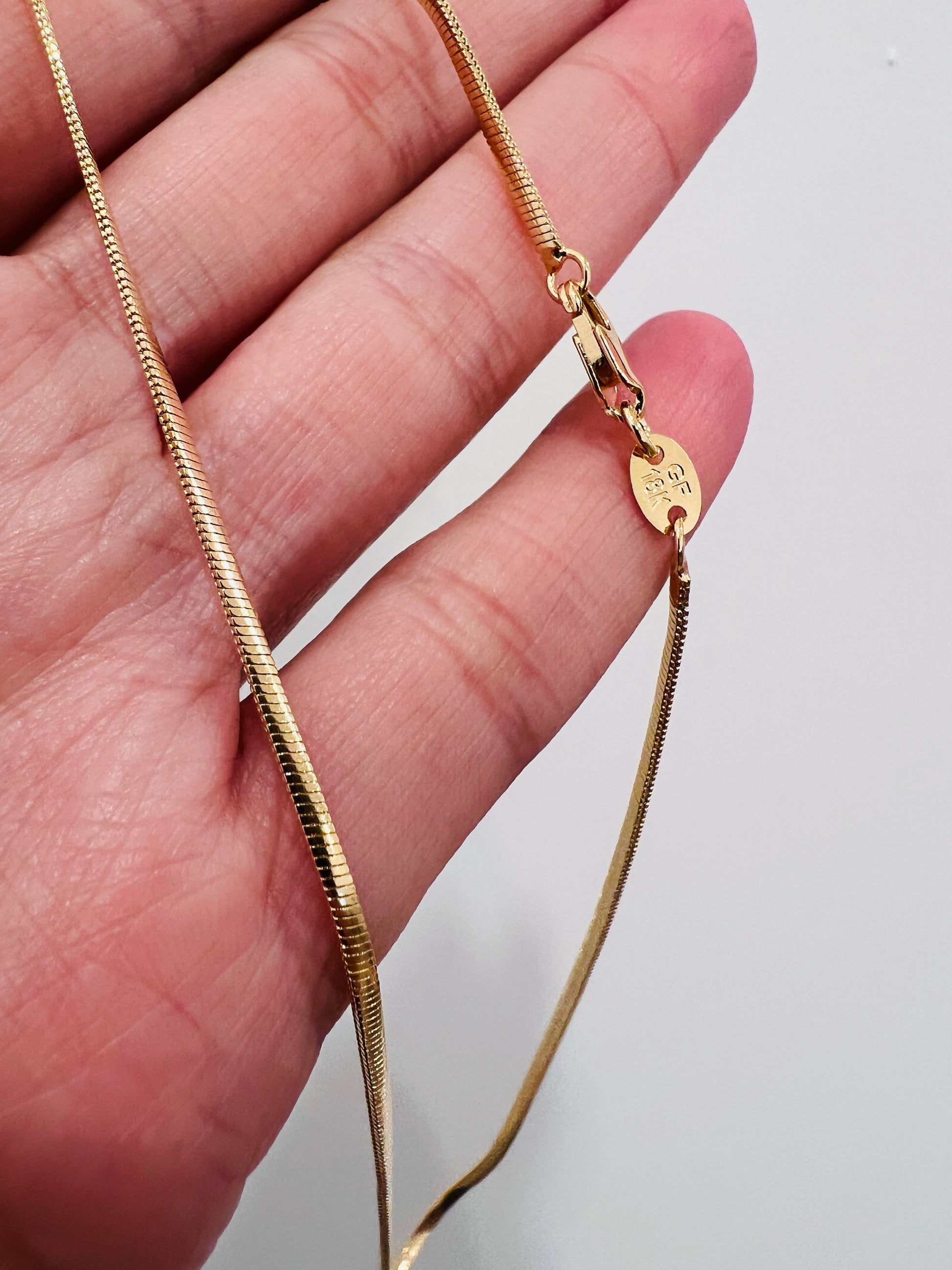Delicate yet refined, the Gold Filled Herringbone Necklace features a sleek 1.5mm flat chain that lies gracefully along the neckline. Available in 14", 16", and 18" lengths, this minimalist staple is ideal for layering or wearing alone as a statement of subtle luxury. Crafted from 18kt gold filled over a durable base metal, it offers the luster of fine jewelry with the strength to stand up to daily wear. The fluid movement of the herringbone design adds elegance to every outfit. A timeless addition to your collection, this piece from Haus of Monogram is designed to elevate your everyday essentials.