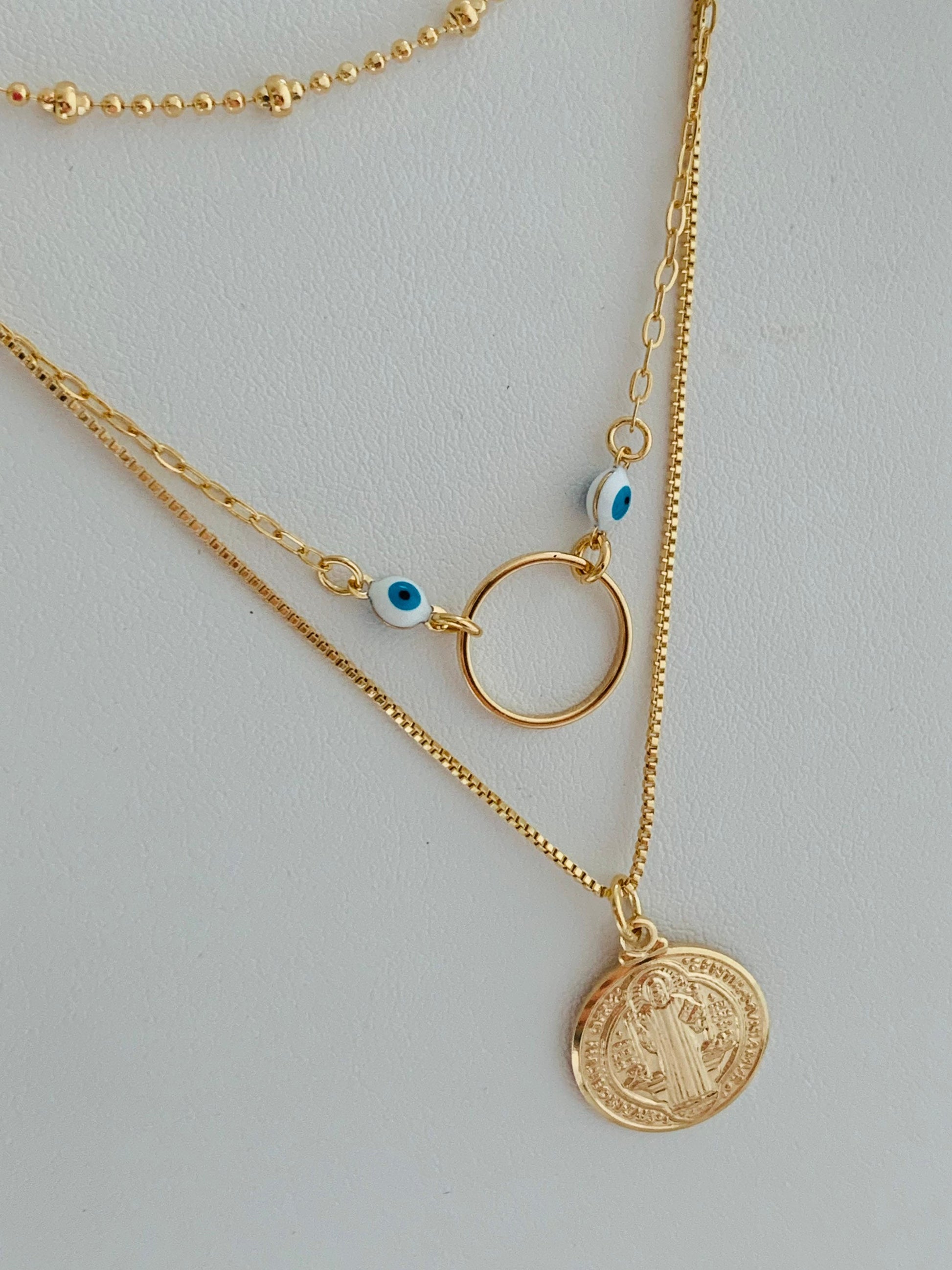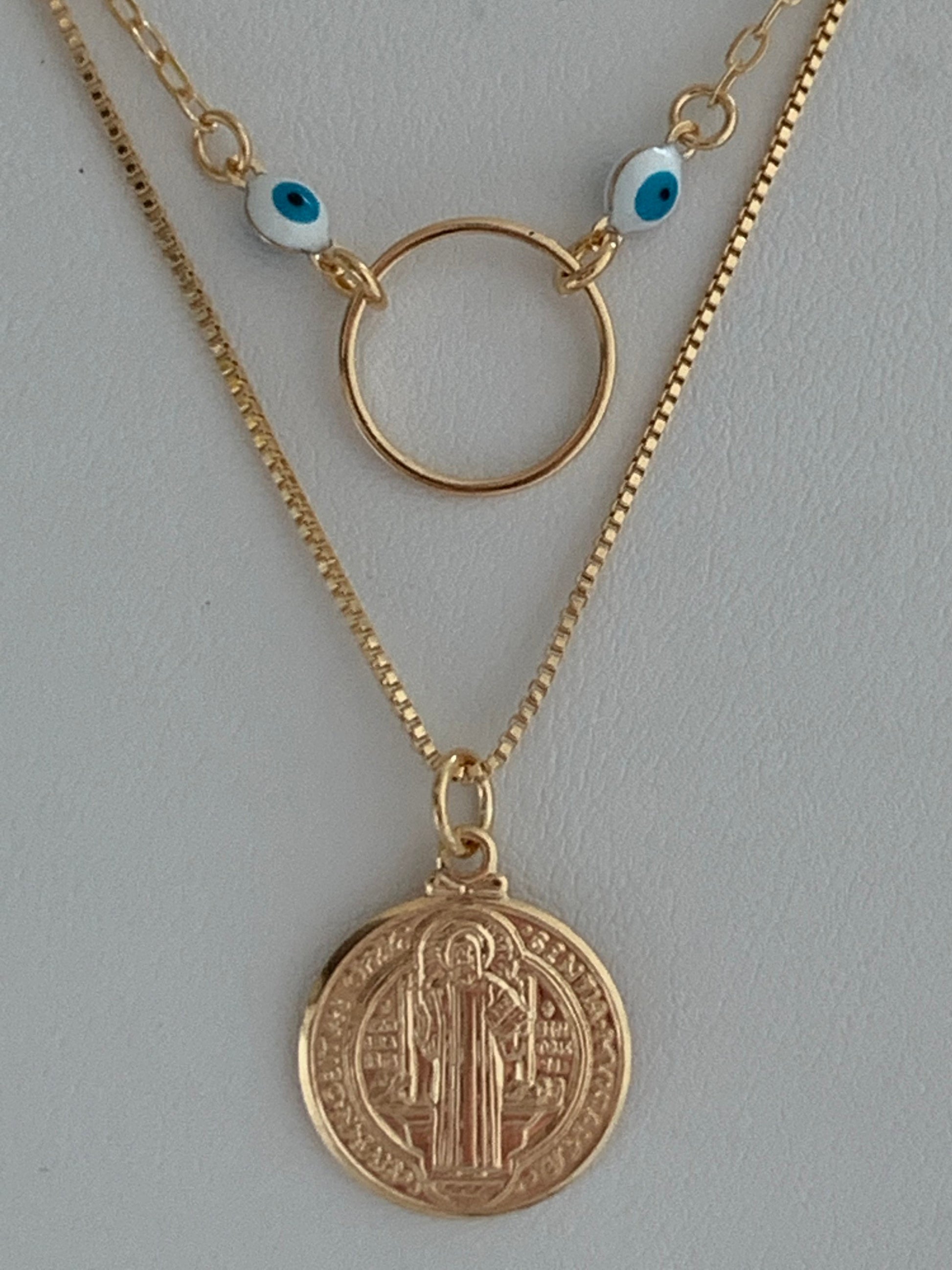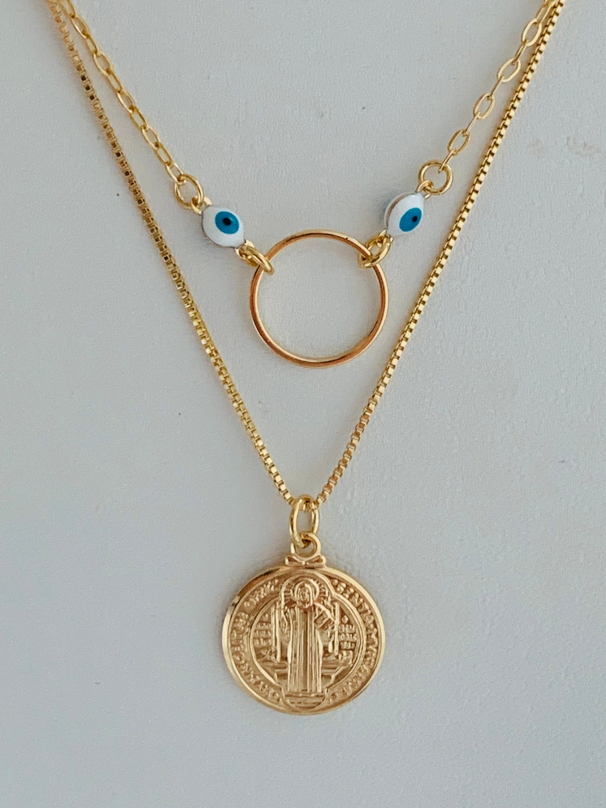 Gold Filled Layered Necklace | Saint Benedict Charm | 15" + 2"
