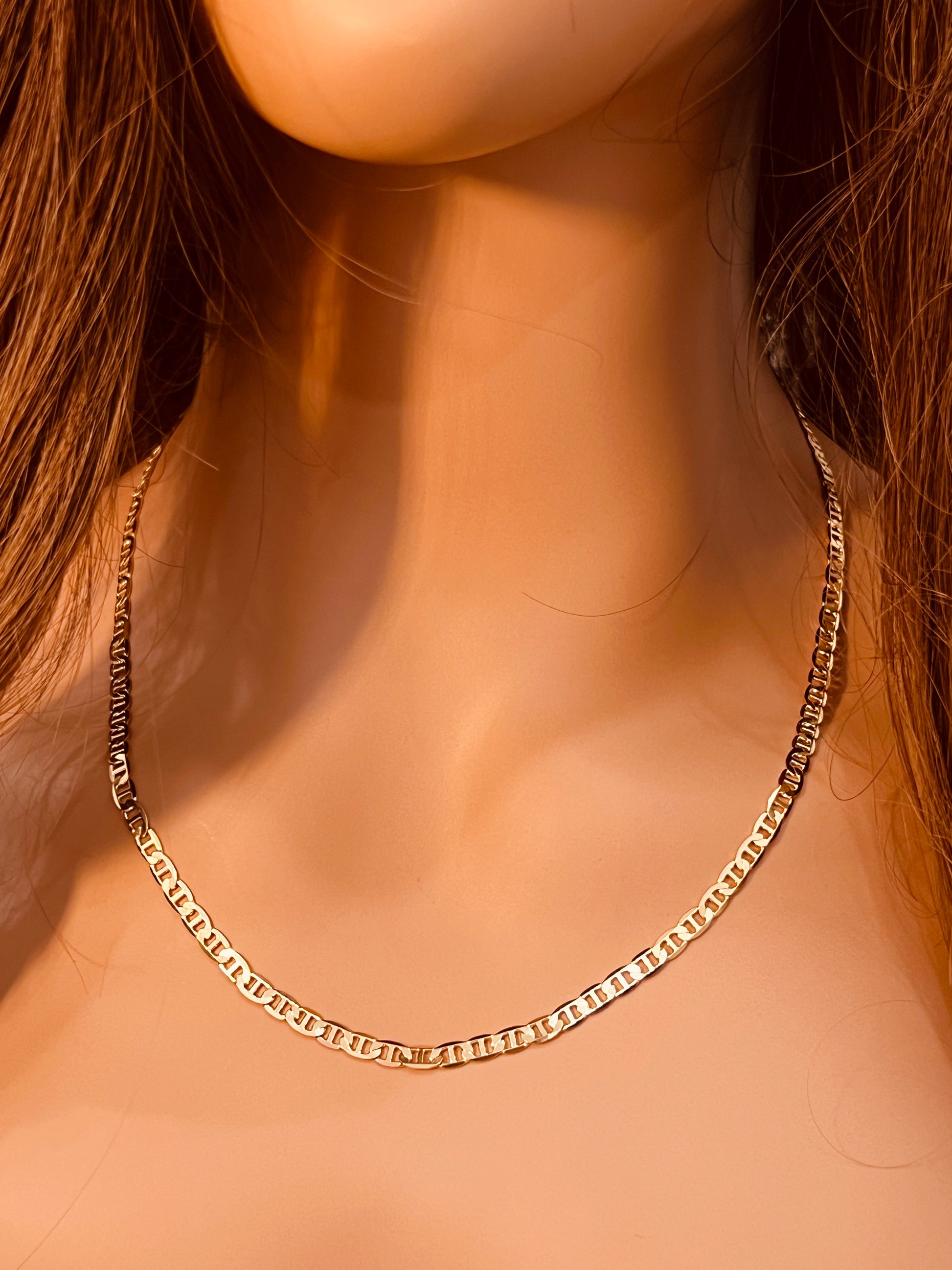 Make a bold yet refined statement with our Gold Filled 3mm Mariner Chain Necklace — a staple piece designed for both men and women who appreciate timeless style and quality craftsmanship. This 3mm wide mariner link chain is crafted from 18kt gold-filled material, offering the rich appearance of solid gold with enhanced durability and affordability.
