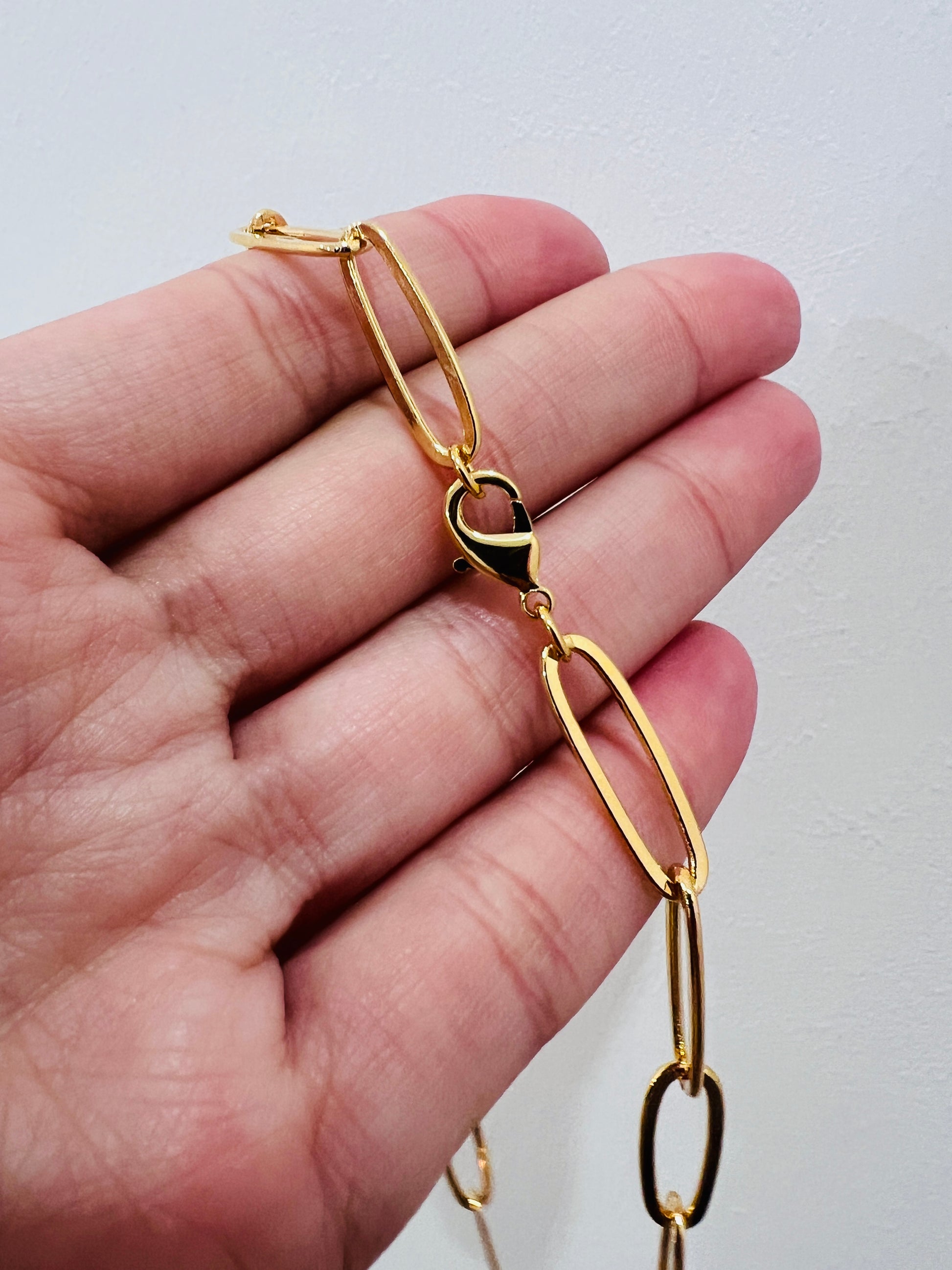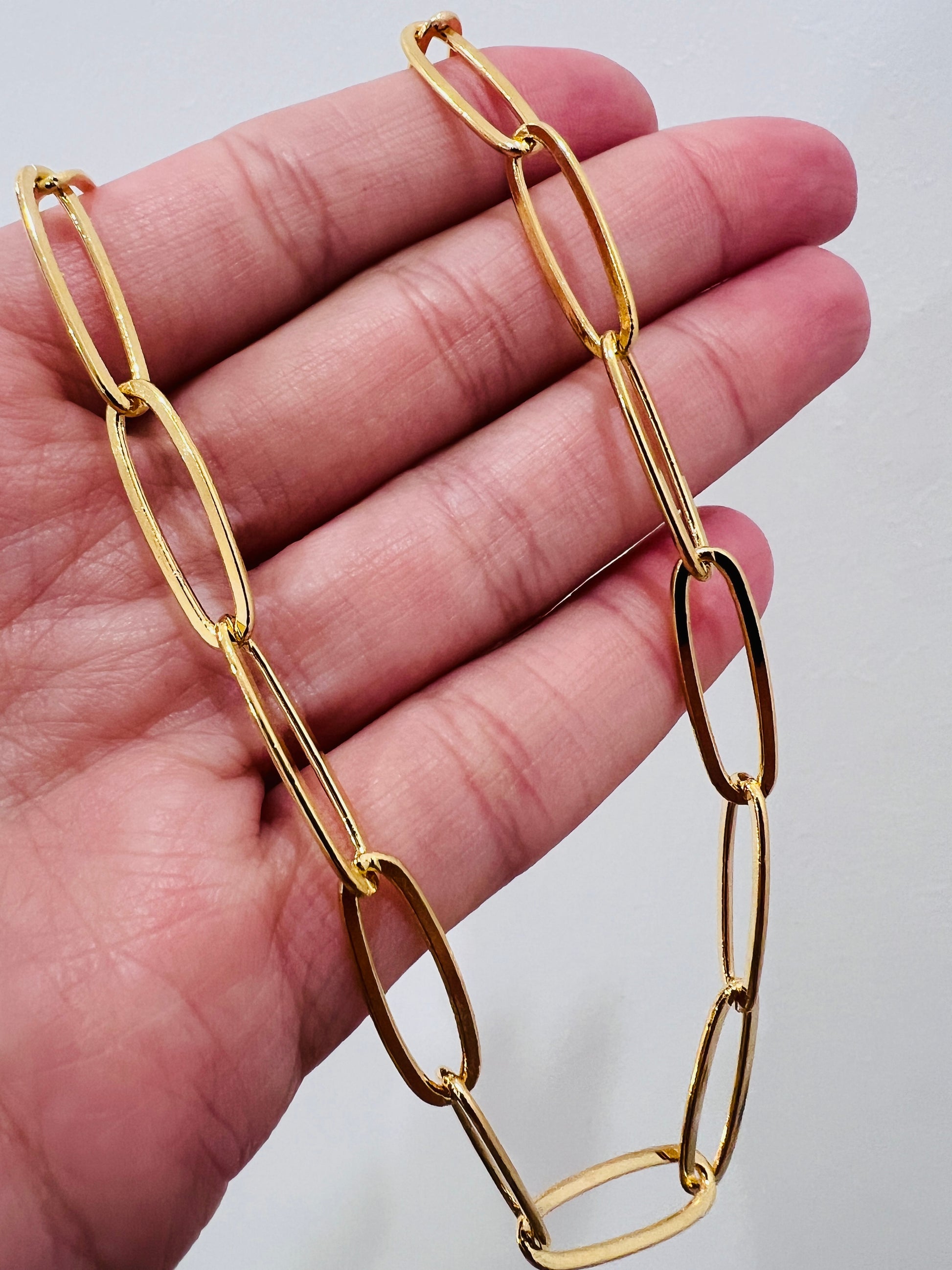 The Gold Filled 6mm Oval Paperclip Necklace from Haus of Monogram brings bold elegance to your jewelry stack. With elongated links sized at 6mm x 20mm, this necklace makes a sleek yet impactful statement, perfect for those who want to stand out with clean, refined lines. Available in 14", 16", and 18" lengths, it layers beautifully with chokers or sits perfectly as a standalone chain. Crafted with a thick layer of 18kt gold bonded to a strong base metal, it delivers the radiance of solid gold with exceptional durability—tarnish-resistant, hypoallergenic, and ideal for everyday wear.