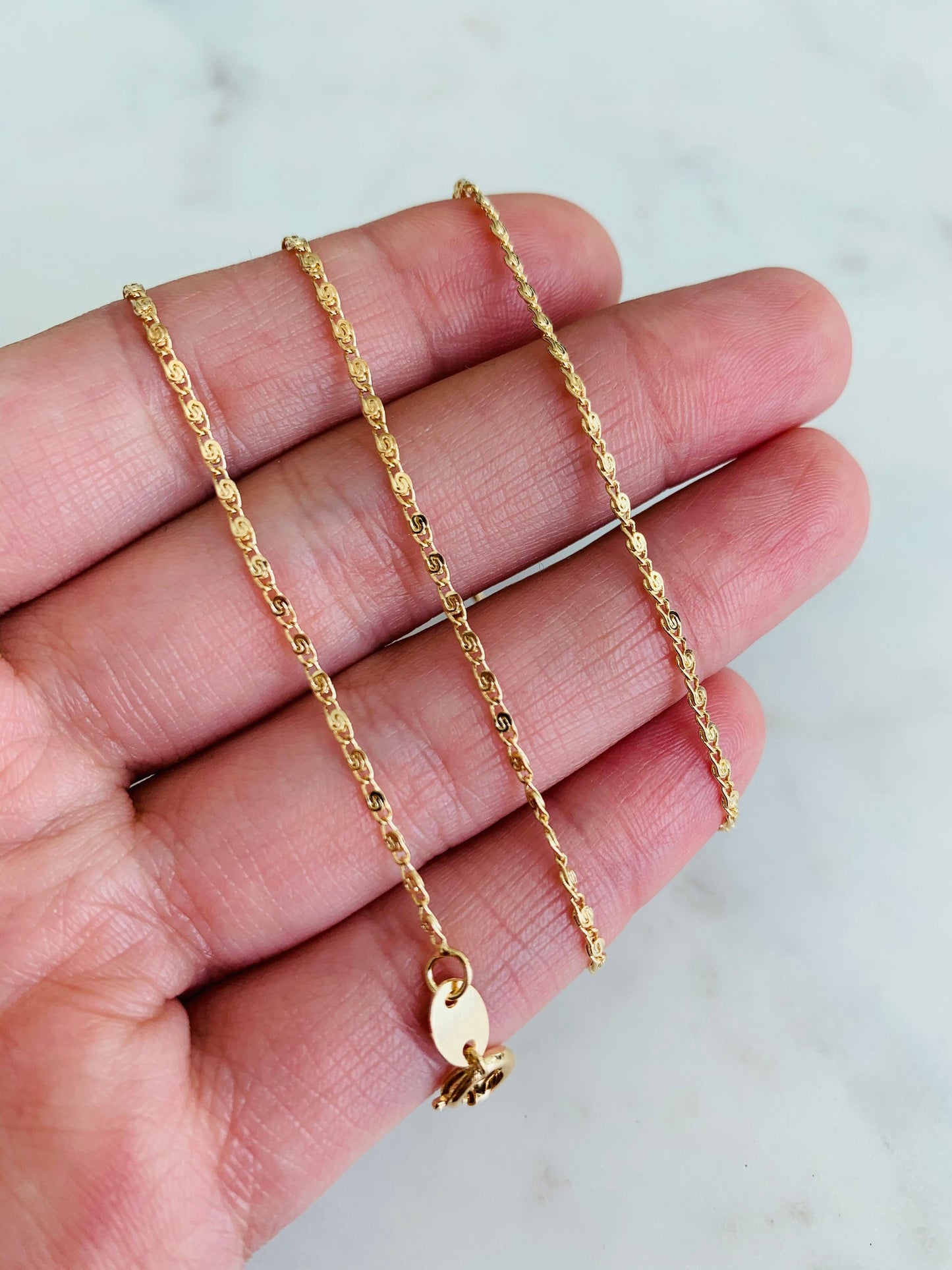 Delicate yet durable, this 1mm Gold Filled Snail Chain Necklace adds a subtle shimmer to any look. Crafted with a solid layer of 18kt gold filled metal, it’s perfect for layering or wearing solo when you want a fine, understated finish. The twisted snail chain design catches the light beautifully, offering texture and shine without overwhelming your outfit. Available in 16", 18", and 20" lengths, it’s a versatile essential for both minimalist styling and elevated layering. Tarnish-resistant, hypoallergenic, and waterproof, it’s designed for everyday wear with lasting quality. Whether you're dressing up or down, this slim chain provides effortless elegance and timeless appeal. Haus of Monogram brings you thoughtful, lasting jewelry that bridges simplicity and luxury with ease.