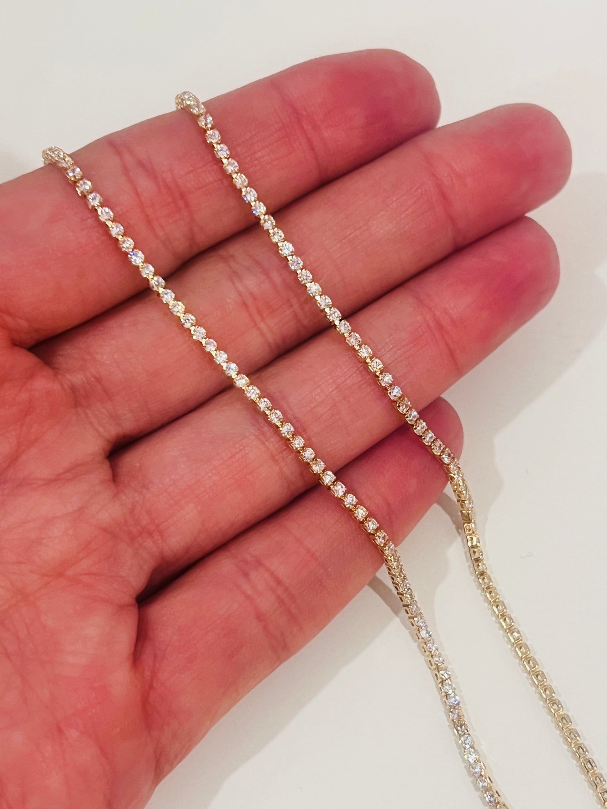 Make a statement with the Gold Filled Tennis Necklace from Haus of Monogram. Featuring a sleek 2mm width and a length of 14.5" with a 2" extension, this necklace offers a perfect fit with a touch of elegance. Crafted with a thick layer of 18K gold bonded to a durable base metal, it's a high-quality alternative to solid gold—made to shine for years with proper care. Its classic, gender-neutral design is perfect for layering or solo wear.