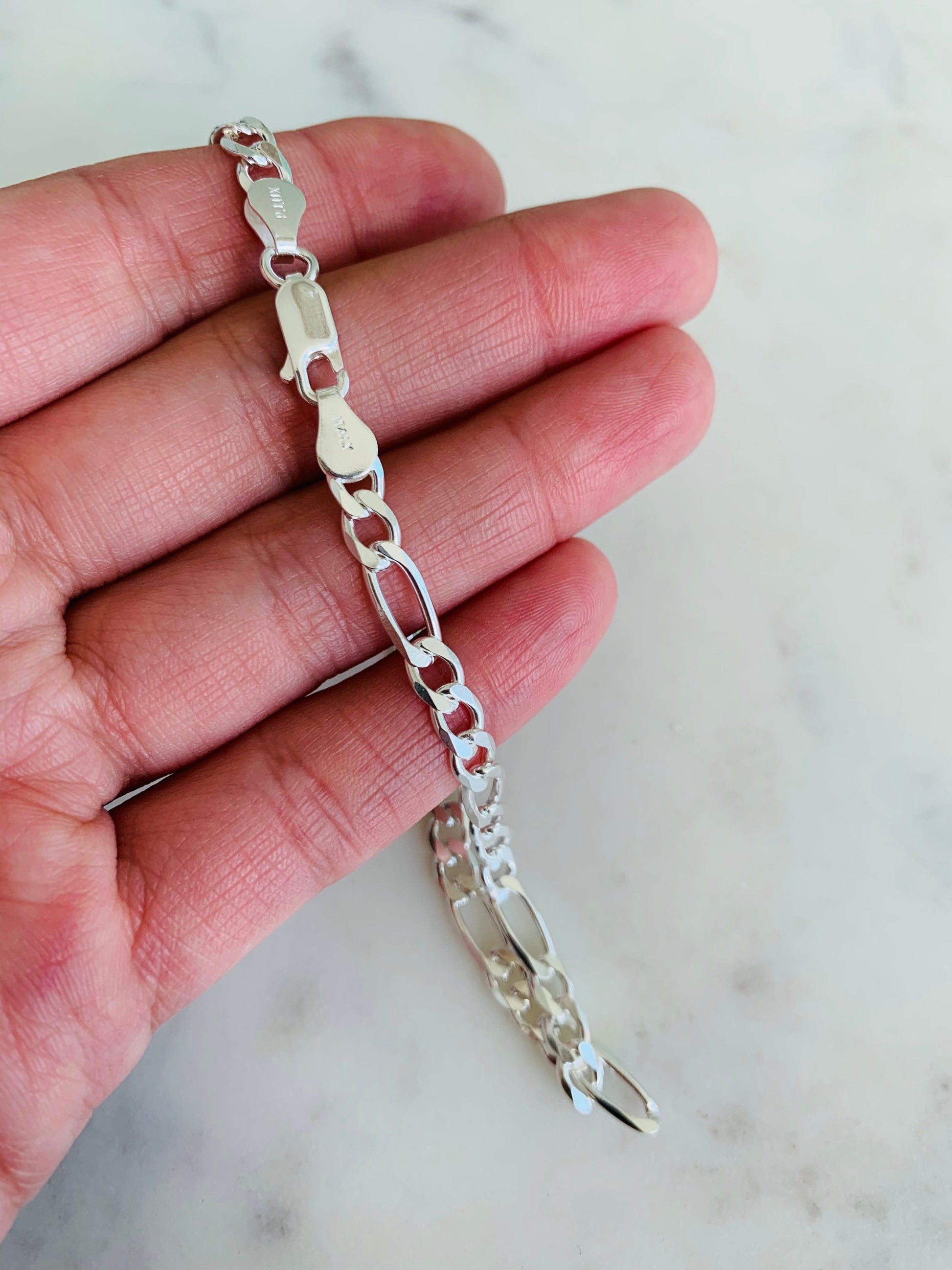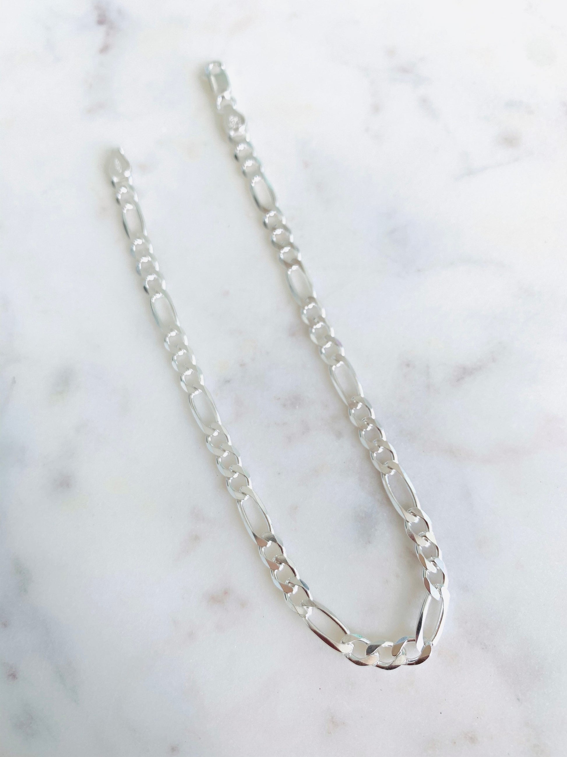 This Sterling Silver Figaro Anklet is crafted in high-quality 0.925 sterling silver, offering a timeless chain style with lasting durability and shine. Thoughtfully made by Haus of Monogram.