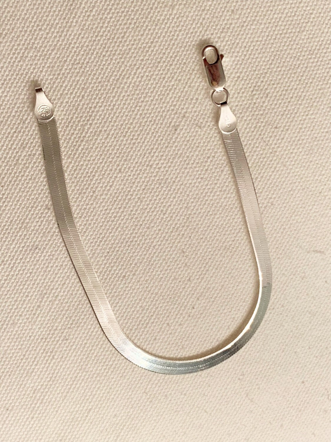 Sleek and sophisticated, this Sterling Silver Herringbone Bracelet adds timeless elegance to any look. With a flat, reflective 4mm surface and a comfortable 7.25-inch length, it lays smoothly on the wrist for a polished finish. Crafted from high-quality 925 sterling silver, this bracelet is ideal for stacking or wearing solo. Whether styled for everyday minimalism or an elevated evening ensemble, this piece delivers versatile shine. Haus of Monogram curates classic essentials like this one, designed to shine for years with proper care.