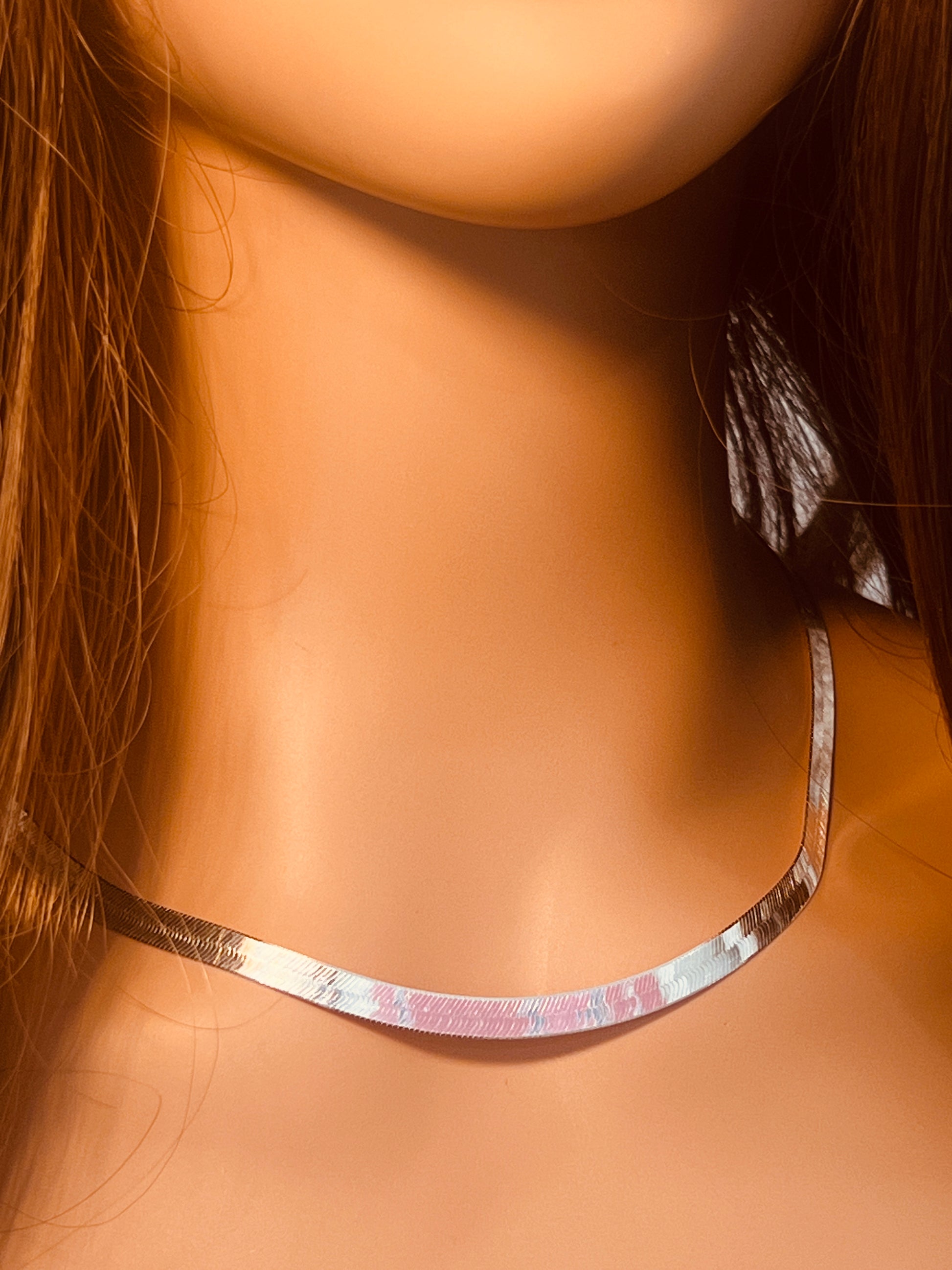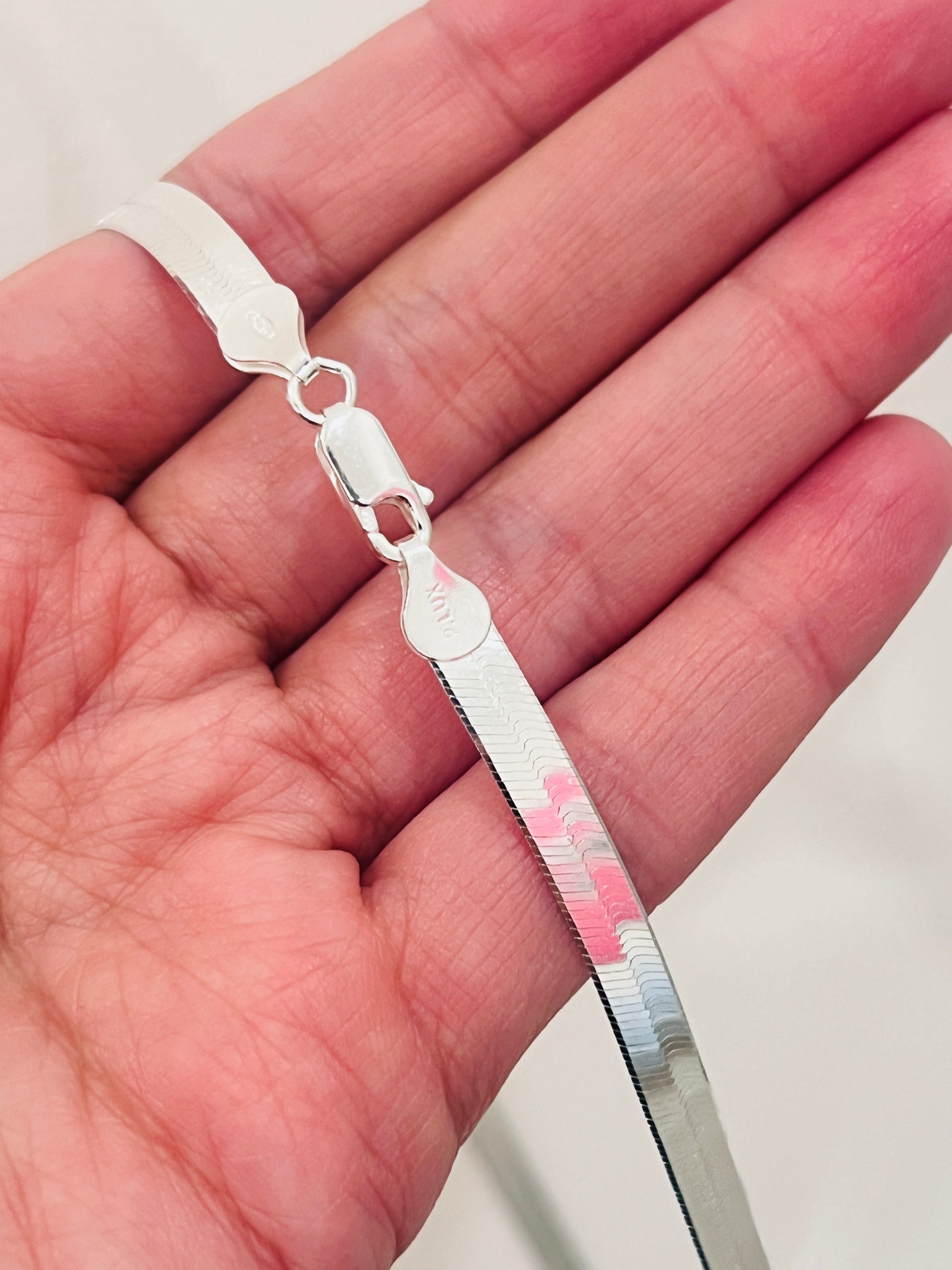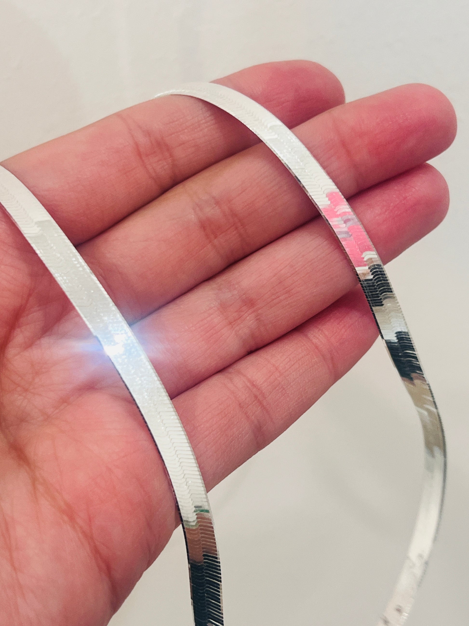 Elevate your neckline with the sleek and sophisticated Sterling Silver Herringbone Necklace from Haus of Monogram. Featuring a bold 5mm width and available in 16", 18", and 20" lengths, this fluid, flat-laying chain glides effortlessly across the skin, offering a high-shine, polished finish that catches the light from every angle. Expertly crafted from solid 0.925 sterling silver, this piece delivers timeless elegance with modern flair—perfect for layering or making a statement on its own. The model is shown wearing the 18" length, ideal for an everyday chic look. Haus of Monogram ensures every sterling silver design is crafted with quality and longevity in mind.